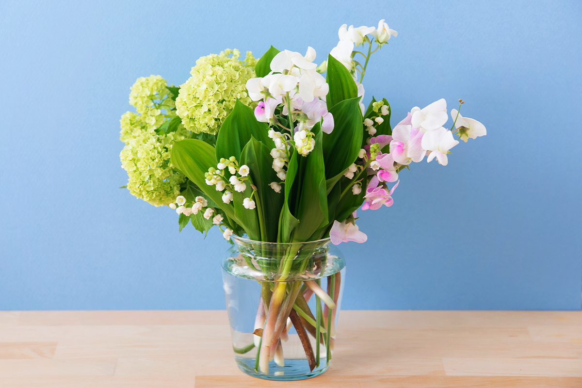 부케에는 좋은 의미가 담긴 꽃들이 주로 사용됩니다. 먼저 작약은 `수줍음` 꽃말을 가지고 있어요. 5~6월에 결혼하시는 신부들이 많이 선택하는 꽃입니다. 겹겹이 쌓인 꽃잎으로 크고 풍성한 꽃송이와 은은한 색상으로 화려하고 우아한 느낌을 줍니다. 카라 꽃은 `천년의 사랑` 꽃말을 가지고 있으며 카라 꽃다발은 `당신은 나의 행운입니다`라는 뜻이 있습니다. 긴 줄기를 가지고 있어 슬림라인 드레스에 잘 어울립니다. 카라는 하얀색 외에도 짙은 빨간색, 노란색, 분홍색 등 많은 색을 가지고 있고 세련되면서도 고급스러운 이미지로 사계절 내내 자주 사용됩니다. 그 외에도 은방울꽃과 장미는 부케로 인기 있는 꽃들입니다. 은방울꽃은 작은 꽃들이 방울처럼 줄기에 맺혀있는 모습으로 수수하고 청순한 이미지를 연상케 합니다. 장미는 `열정적인 사랑`의 꽃말로 다양한 색상과 모양으로 신부의 이미지와 체형에 맞게 선택할 수 있어 부케로 사용하기에 좋은 꽃입니다."